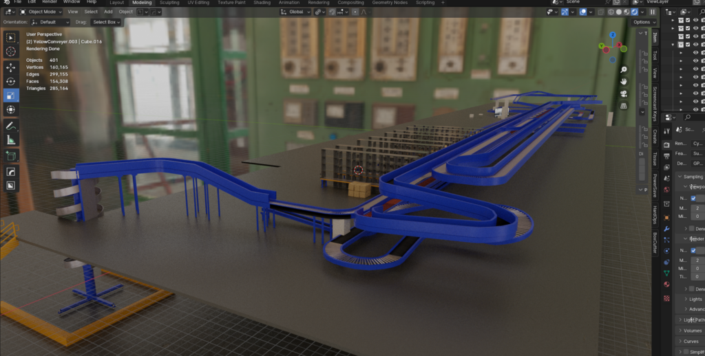 This environment was developed for an industrial client specializing in conveyor belt software. The project involved optimizing the existing environment, reducing its size, enhancing it with textures, modeling the shelves, and designing additional hard surface objects.