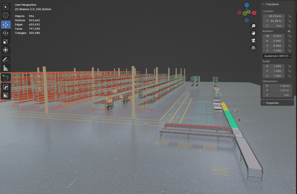 I am tasked with creating a low-poly digital twin of the Journeys shipping facility, a retail chain owned by Genesco with over 800 stores. I collaborate with a team of engineers who provide essential data, including blueprints, measurements, and video walkthroughs of the facility. This model will be integrated into software to support facility operations and logistics.